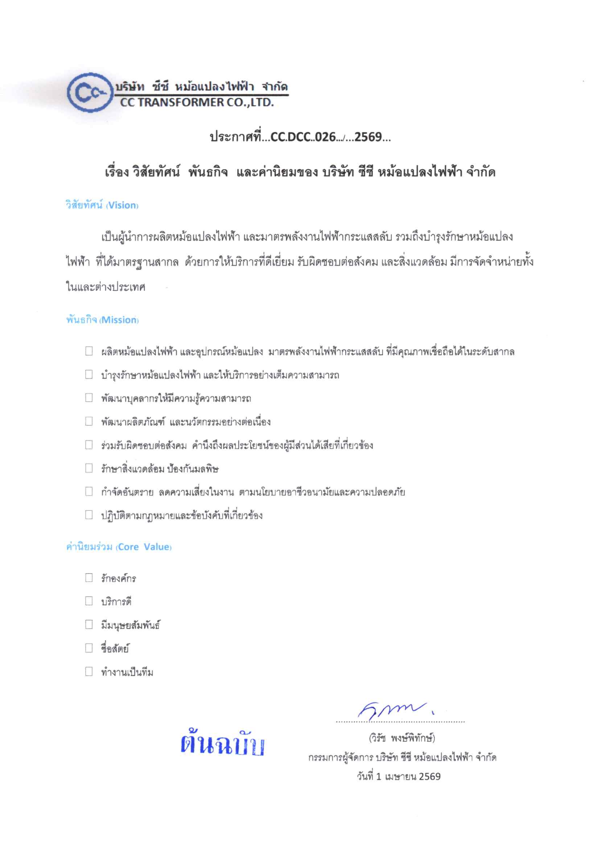 ซีซีหม้อแปลงไฟฟ้า ได้รับการรับรอง ระบบการจัดการสิ่งแวดล้อมมาตรฐาน ISO 14001:2004