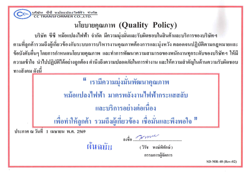ซีซีหม้อแปลงไฟฟ้า ได้รับการรับรอง ระบบการจัดการสิ่งแวดล้อมมาตรฐาน ISO 14001:2004 ออกแบบและพัฒนา การผลิตหม้อแปลงไฟฟ้าระบบจำหน่ายชนิดระบายความร้อนด้วยน้ำมัน(Oil-immersed distribution transformer)และบริการ ซ่อม/บำรุงรักษา หม้อแปลงไฟฟ้ากำลัง(Power transformer)